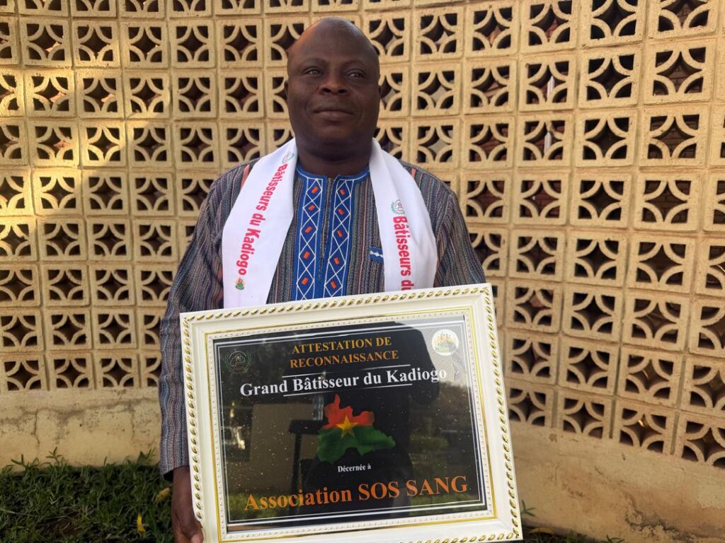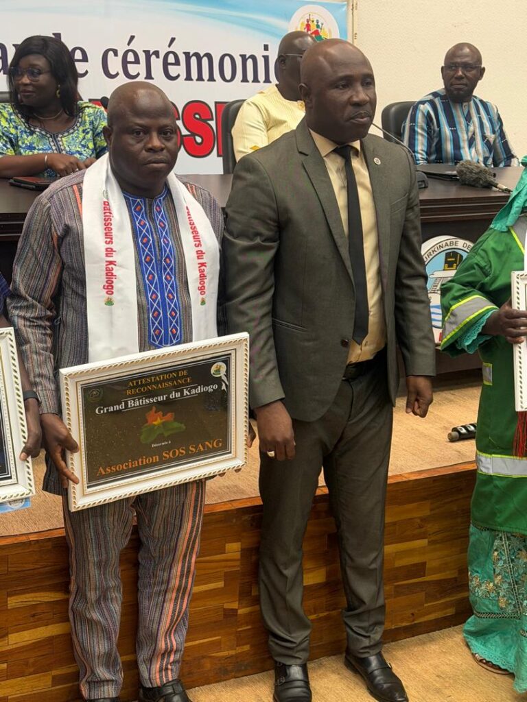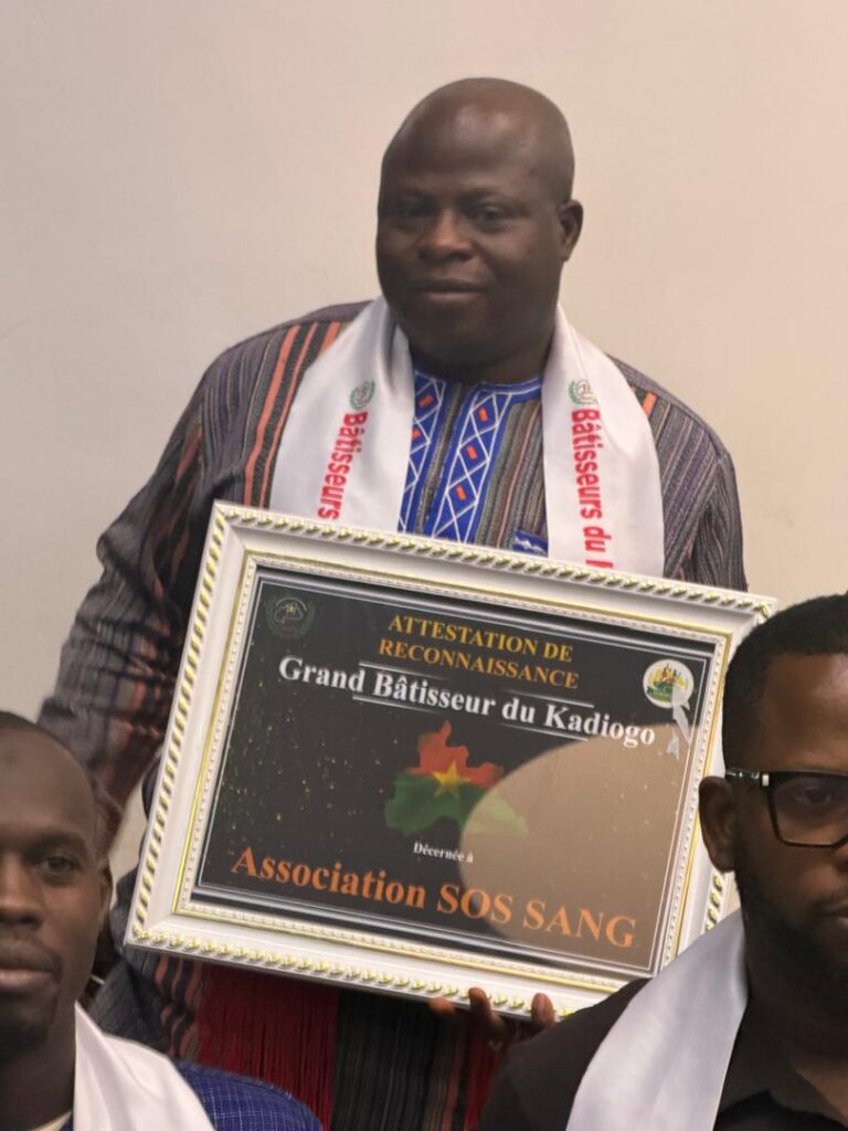 Au cours de ladite cérémonie présider par le Gouverneur de Kadiogo et dénommée « Les bâtisseurs du Kadiogo », l’association « S.O.S Sang » a reçu une distinction dans le domaine associatif pour sa contribution au rayonnement de la région de Kadiogo à travers ses activités de promotion et du don de sang bénévole.